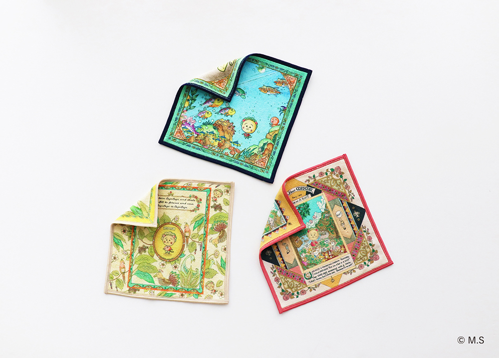 扉絵の「アクアリウム」、「鳥たちと植物」、「メルヘンの国」の日常のワンシーンをクラシカルな雰囲気で表現した3柄を展開。マイクロファイバーを使用しているので、手を拭くのはもちろん、スマホやメガネなどを拭くのに便利な一枚。それぞれ、裏表の両面に描かれているデザインをお楽しみいただけます。