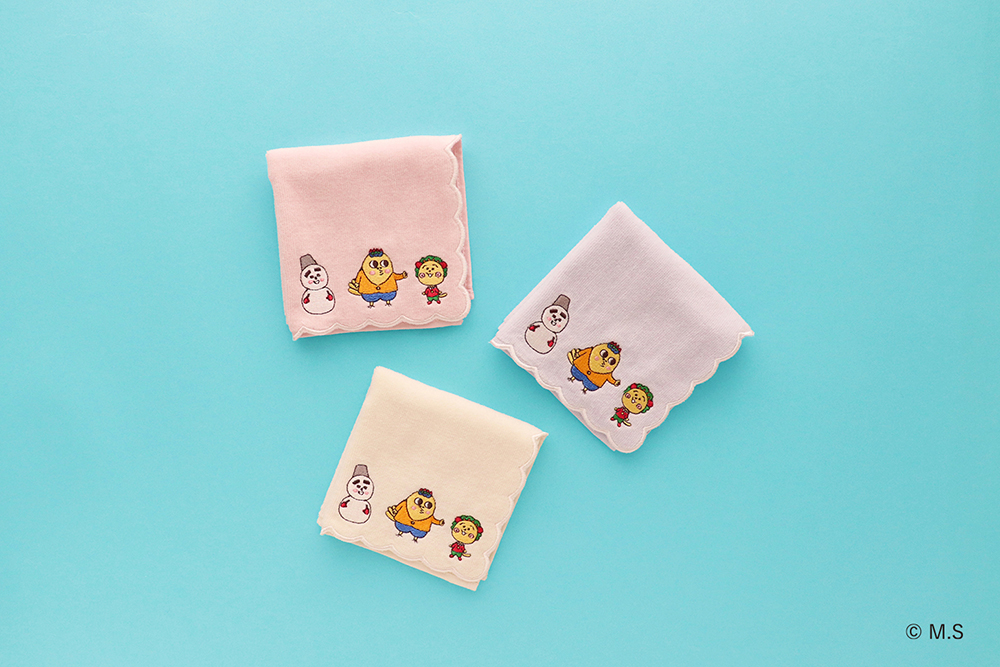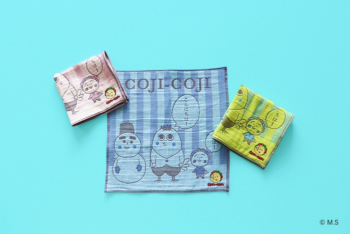 コジコジと次郎、トミー、テル子、カツブーが、ゆったりくつろぐほのぼのとしたデザインと、コジコジ、次郎、コロ助が挨拶をしている、日常のワンシーンを表現した可愛らしいデザインの2柄を展開します。右下にはコジコジの刺繍をあしらい、さりげないアクセントに。使うたびに日常のちょっとした癒しを感じられる一枚は、お子様から大人まで幅広くお使いいただけます。
