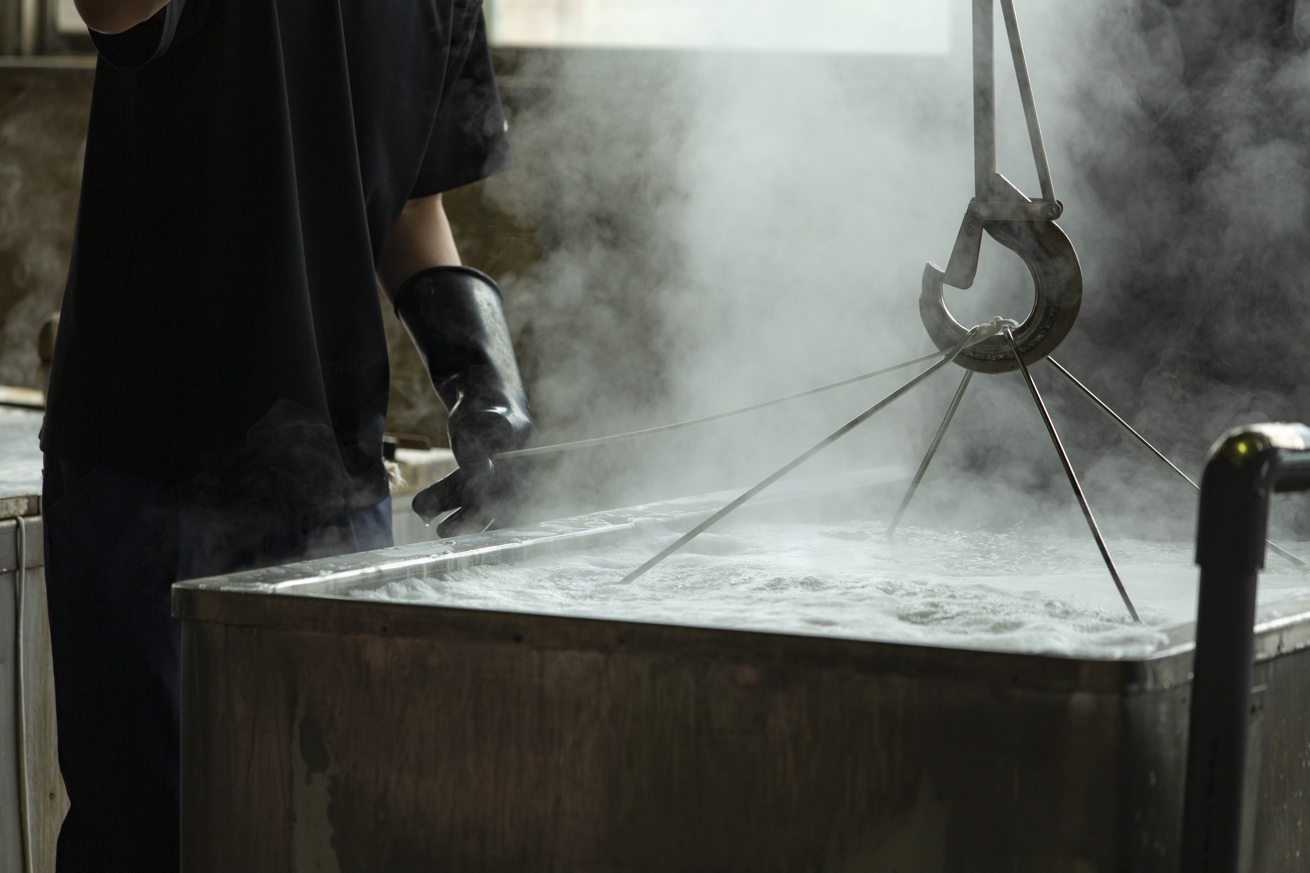織り上がった後染絹織物(製織後に友禅をはじめとする染色加工を施す白生地織物)の繊維に含まれる不純物や、「セリシン」と呼ばれるたんぱく質を取り除き、シルク本来の美しさと光沢を発揮させるための加工です。