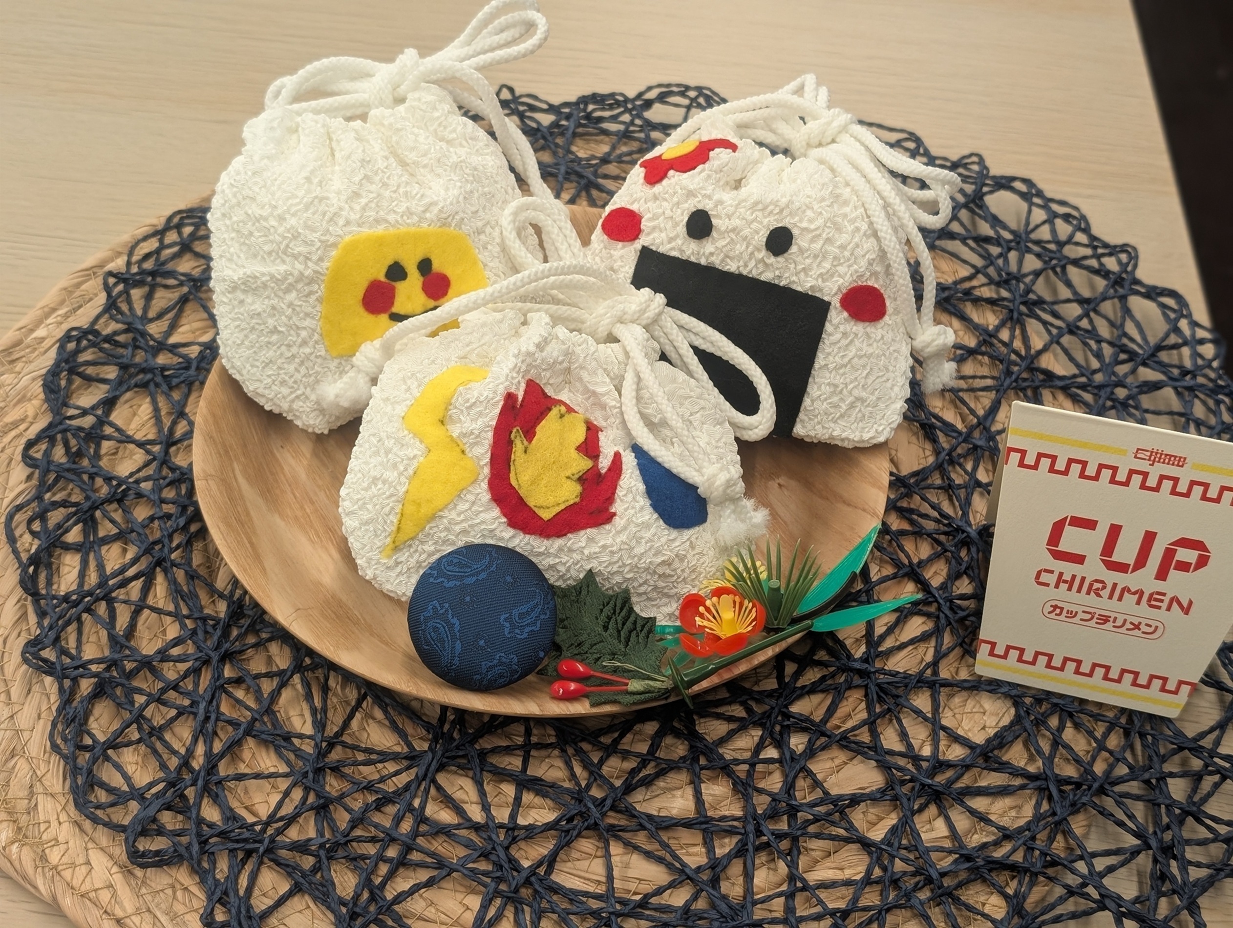 丹後ちりめん(ポリエステル)の生機(織ってすぐの状態)をお湯で縮めて、おにぎりのような巾着袋をつくるワークショップです。