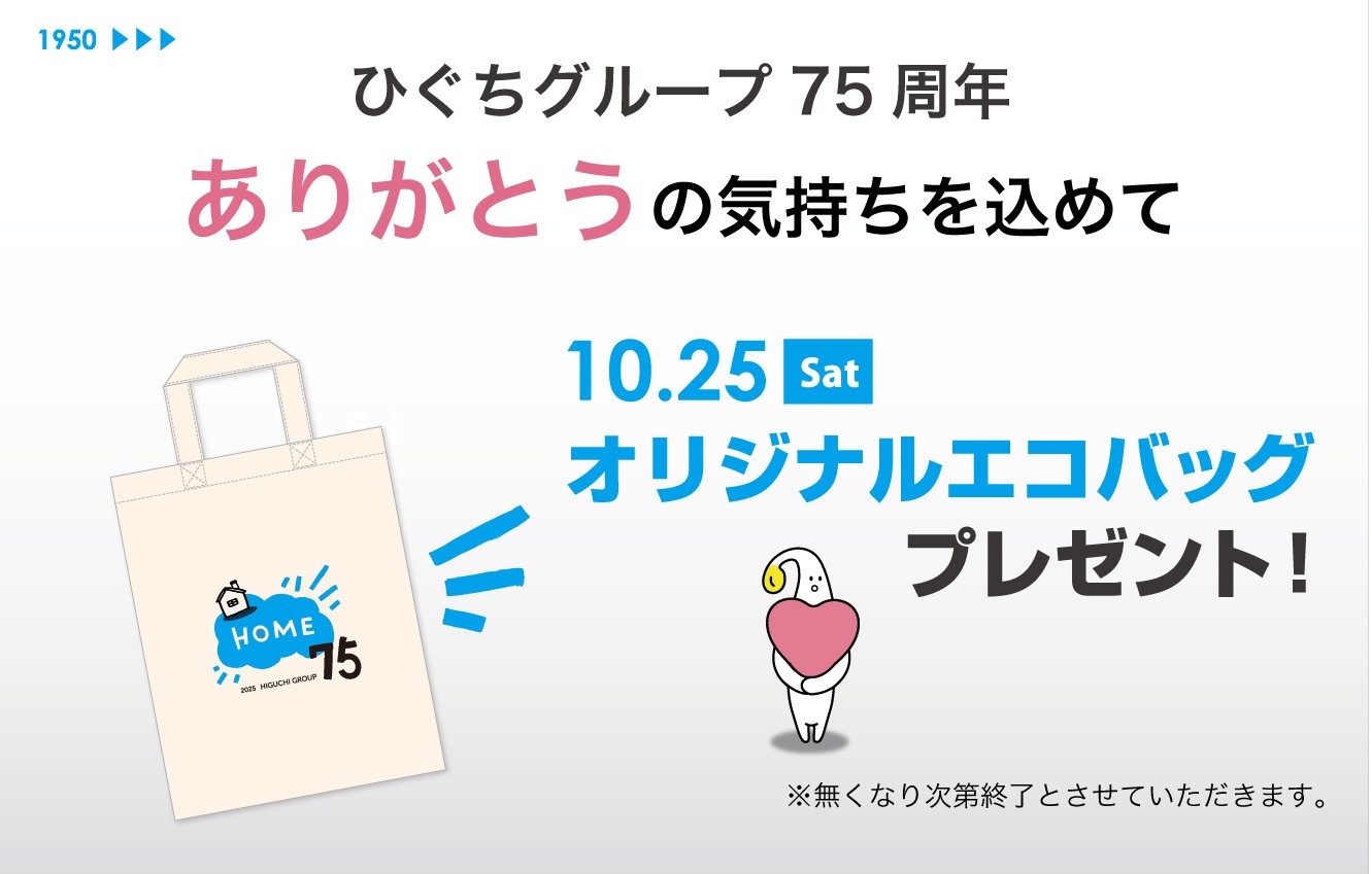 HIGUCHI GROUPは、1950年の創業以来、長きにわたり地域社会とともに歩んでまいりました。この節目を迎えるにあたり、お客様への感謝を形にするため、70周年より継続している「オリジナルエコバッグ」を75周年記念デザインで制作いたしました。