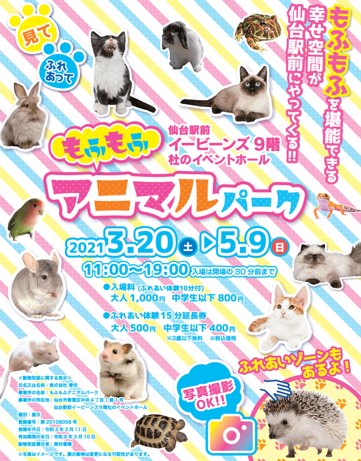 株式会社宮城テレビ放送(所在地:宮城県仙台市)は、可愛らしい小動物たちを集めた展示・ふれあいイベント「もふもふアニマルパーク」を仙台駅前イービーンズで2021年3月20日より開催いたします。