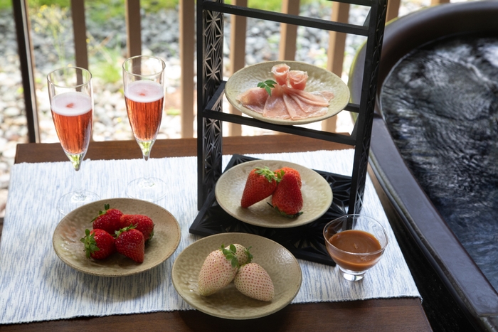 旬の時期にさまざまな品種を楽しめるように、幻のいちご「とちひめ」を含むいちご3種の食べ比べを提供します。栃木県では、これまでにさまざまないちごの品種が開発されてきました。その中でも「とちひめ」は、果肉が柔らかく県外への輸送に適さないため、「幻のいちご」と呼ばれています(*2)。「とちひめ」を含むいちご3種の食べ比べで、栃木県生まれのいちごを楽しめます。さらに、食べ比べをより楽しめるように、いちごと相性のよいフードとドリンクを用意します。フードは、「星野リゾートのミルクジャム(*3)」と、栃木県の銘石「大谷石」の蔵で熟成させた生ハムの2品です。いちごとの意外な味の組み合わせを発見できます。ドリンクは、いちごのスパークリングワインです。いちごとドリンクで入浴によって失われるビタミン・ミネラルや水分を補給し、リフレッシュできます。