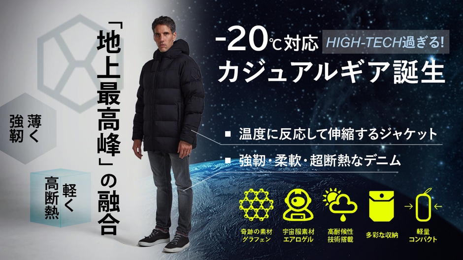 もはや無敵とも言える、グラフェンとエアロゲルの究極素材を搭載した、パファージャケットとデニムジーンズの開発を果たしました。