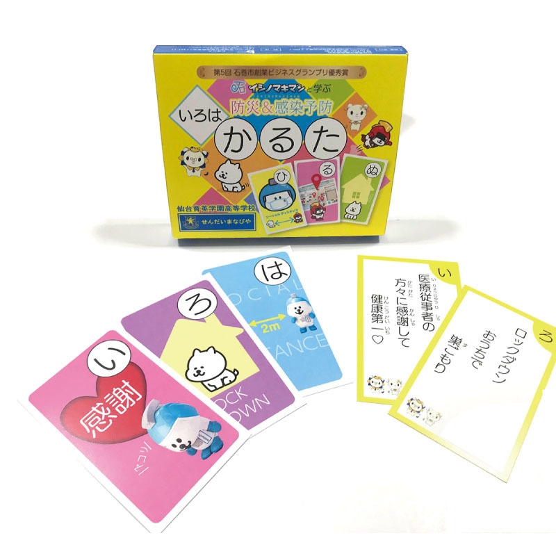 仙台育英学園高等学校とイシノマキマンのコラボ商品が登場! 楽しく学べる「防災&感染予防 いろはかるた」12月13日発売