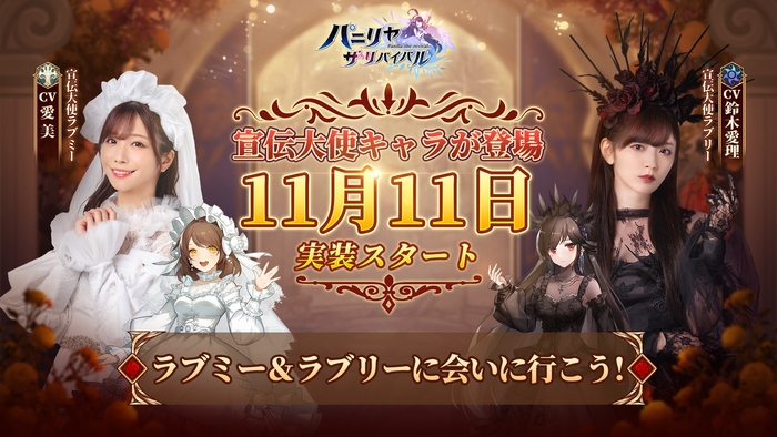 運命の神殿に属する、爽やかな明るくて妹のことが大好きな姉のラブミー(人気声優の愛美さんが演じる)とアビスの国に属する、無関心な性格だが人に頼まれると断らずに助けに行く妹のラブリー(人気歌手の鈴木愛理さんが演じる)が本作の宣伝大使として、11月11日にゲーム内で実装され、彼女たちと一緒に冒険の旅へ行くことができます。