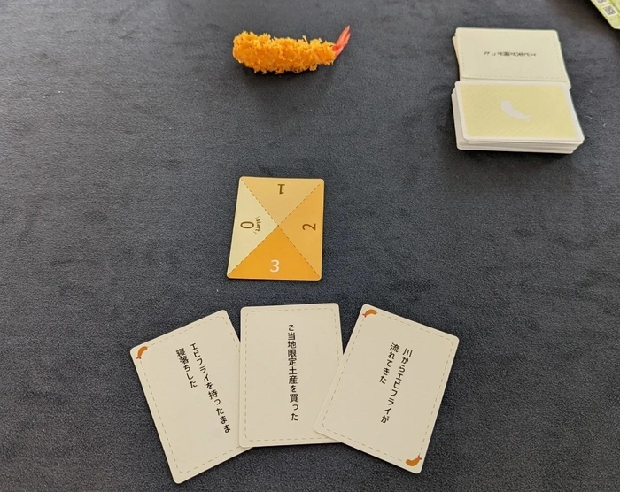 お題に合う物語を創作して話のオチにエビフライが出てくるかを予想し、付属のエビフライを取る