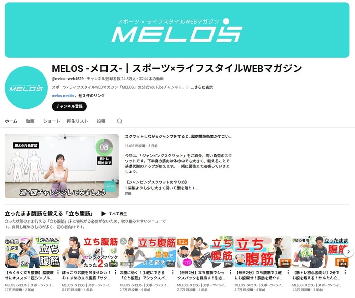 スポーツ×ライフスタイルWEBマガジン「MELOS」は、2020年8月より本格的にYouTubeでのトレーニング動画配信を開始。自宅でできる筋トレや実践的なエクササイズを中心に、わかりやすく丁寧な解説を心がけたコンテンツを発信し、チャンネル登録者数は25万人を突破しています。