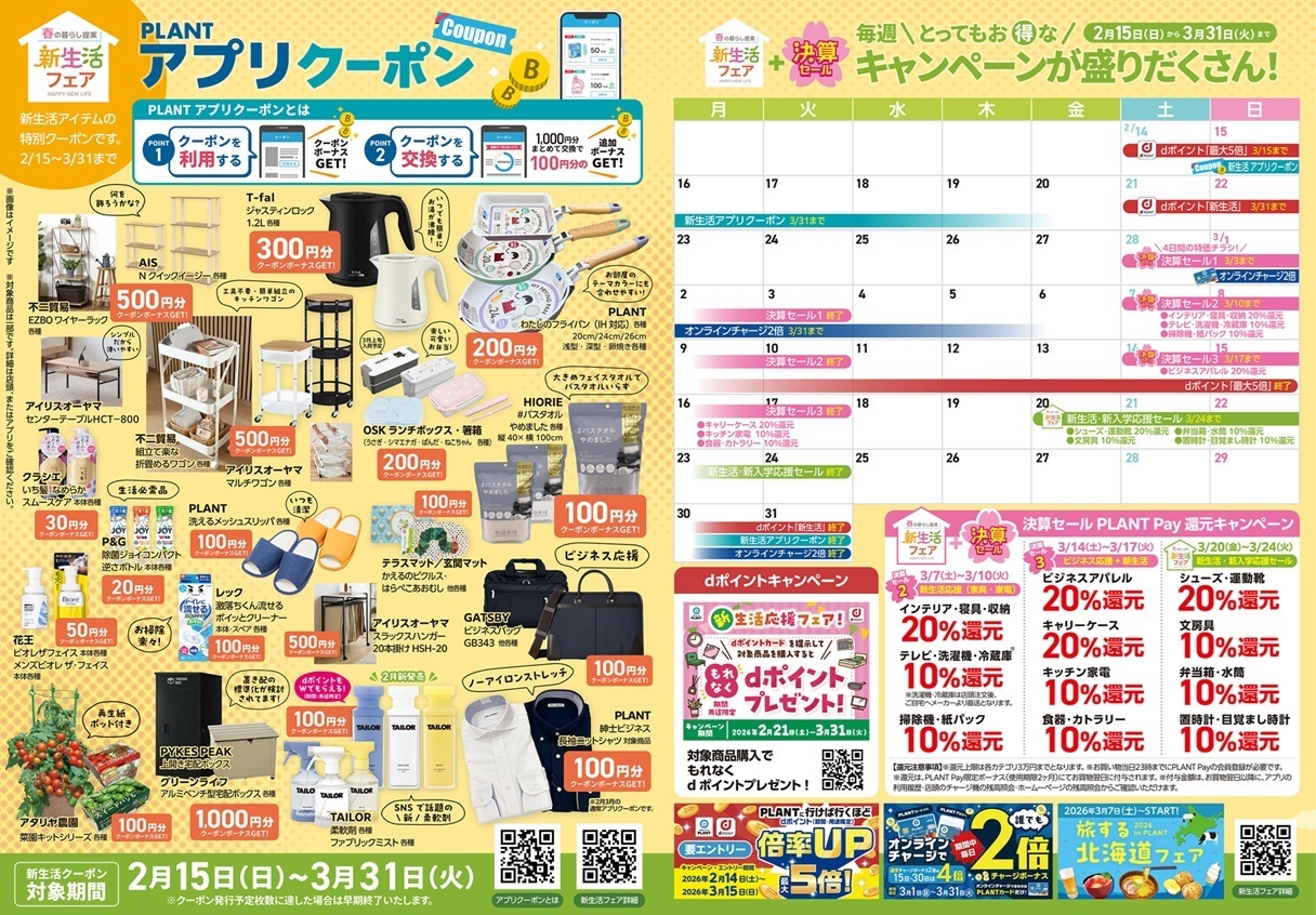 株式会社PLANT(本社:福井県坂井市 代表取締役社長 三ッ田 泰二)は、2026年2月15日(日)よりPLANT全店で『新生活フェア』を開催いたします。