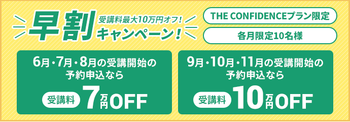 また、『早割キャンペーン』では6月以降の受講をあらかじめ予約していただくことで最大10万円オフとなりますので、今すぐ受講開始しなくてもよい方には大変お得なキャンペーンとなっています。