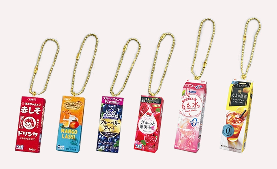 『エルビードリンク マスコットボールチェーン』は、株式会社エルビーの人気紙パックドリンク「ばあちゃんの赤しそドリンク、ブルーベリーアイ+、ぎゅっと果実+酢ざくろミックス、WorldTripマンゴーラッシー、大人の紅茶レモンティー、さわやか果物 もも水」のパッケージをそれぞれ小さいサイズで再現したものです。