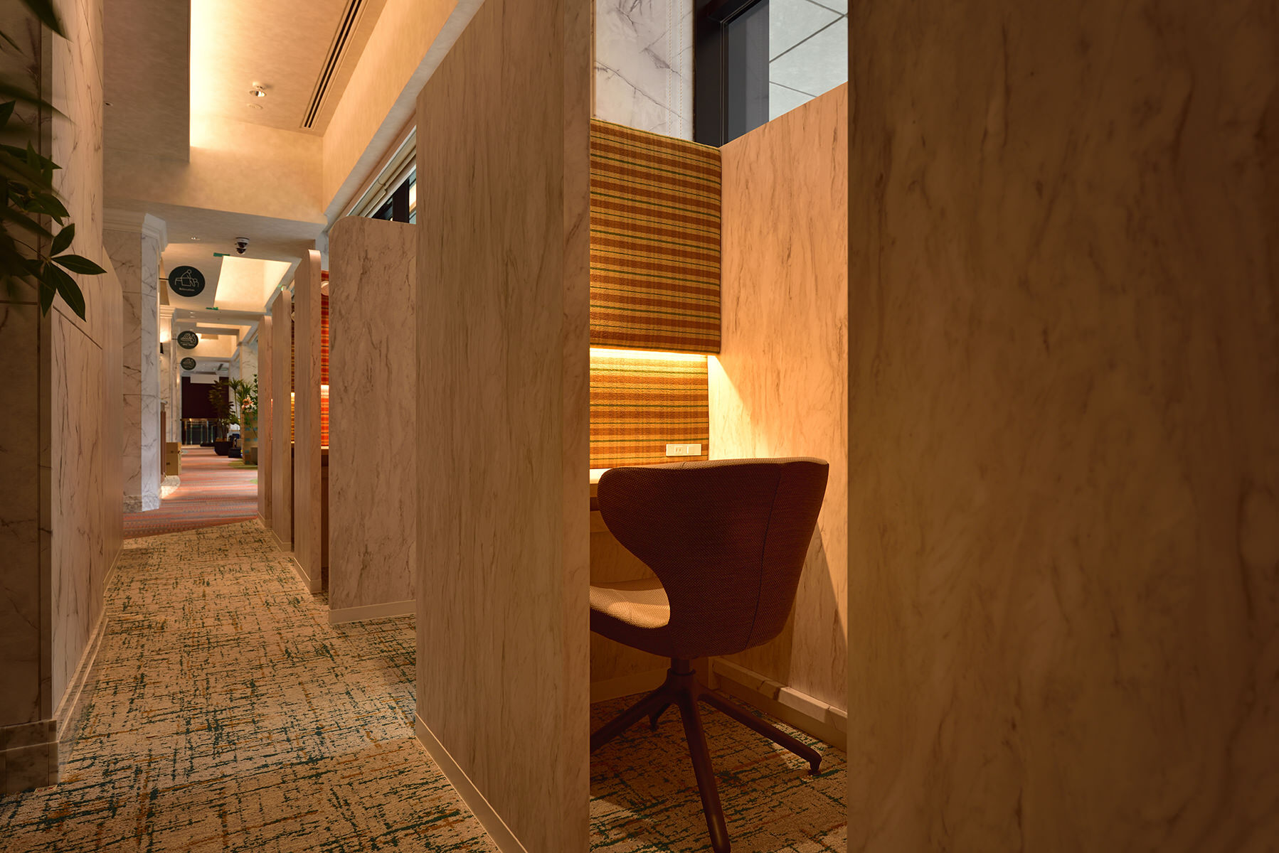 サウナ後のクリアな思考状態を活かし、そのまま仕事へと移行できる新しいワークスタイルを提案する空間です。壁面には、自動車の防音技術を応用した吸音シート「のどかな葉」を採用し、周囲の音を気にせず集中できる環境を整えています。