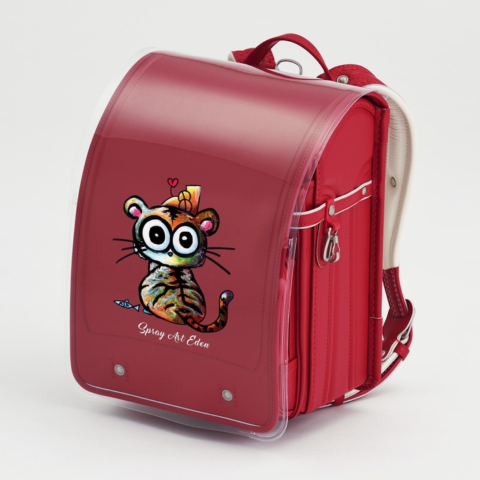 「スプレーアートエデンコラボランドセルカバー」は、ランドセルのカブセ(ふた)部分に装着する透明カバーに、スプレーアートエデンのデザインを印刷したものです。縁まですべて透明なカバーに印刷することで、本物のスプレーアートが施されたような視覚効果を実現しています。