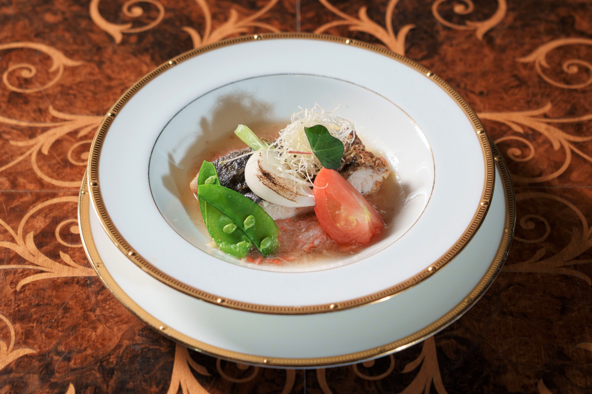 魚料理/淡路島産鰆のロースト ズワイ蟹の身と焼カブラ 魚介のフォンと香草