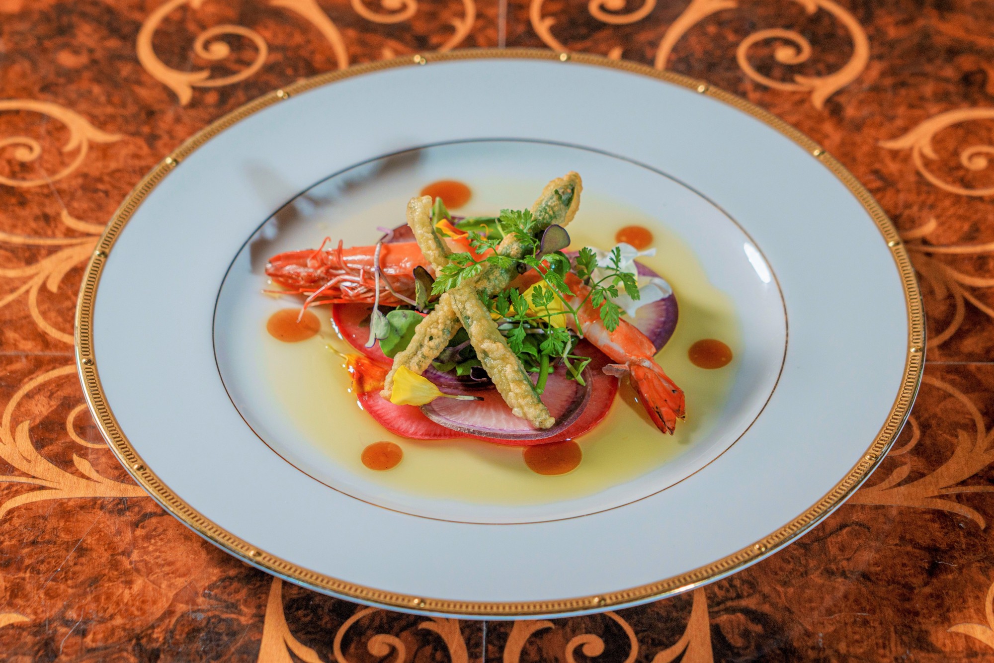 前菜/彩り大根とインゲンのベニエ 淡路島産足赤海老添え