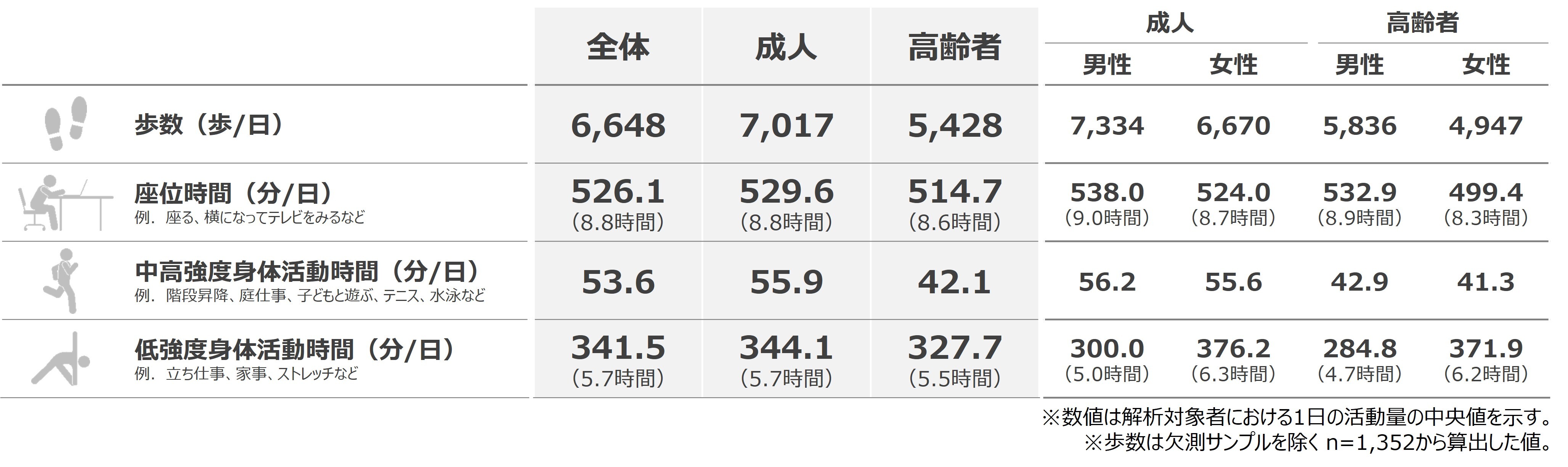 ・1日あたりの歩数は6,648歩、座位行動時間は8.8時間であった。