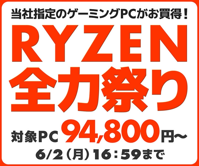 パソコン工房では、ただいま「RYZEN全力祭り」を開催中です! 当社指定のRyzenプロセッサーを搭載している対象BTOパソコンが6月2日(月)16:59までの期間限定でお得に手に入るチャンスとなりますので、この機会をお見逃しなく!