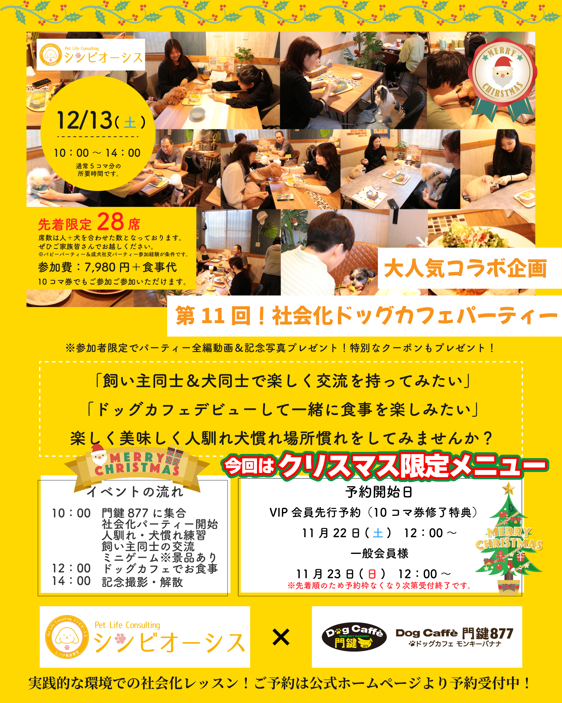 犬の行動・健康・栄養・住環境までを多角的にサポートするPet Life Consulting シンビオーシス(代表:岡田 敏宏/埼玉県さいたま市)は、2025年12月13日(土)に、実際のドッグカフェを舞台にした体験型イベント『第11回 社会化ドッグカフェパーティー ~クリスマス~』を開催いたします。