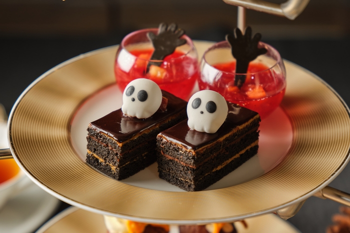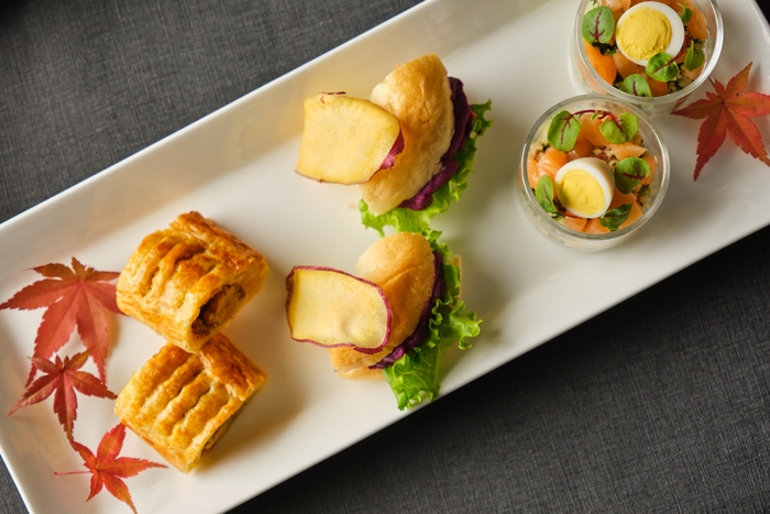 今年の秋のアフタヌーンティーのテーマは、「大人のハロウィン」。カシスと栗のモンブラン、ブドウとヨーグルトのヴェリーヌ、柿と白あんの和風マカロン、ヘーゼルナッツとアマレットのオペラなどのスイーツに加え、パンプキンミートパイ、紫芋のミニベーグルなど、秋の味覚をふんだんに取り入れた上品なスイーツや軽食をお楽しみいただけます。