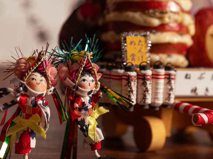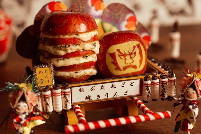 焼きりんごは、ねぶたの山車を模したオリジナルの器で提供します。跳人(はねと)や山車を引く人の持ち手、題名が書かれた看板を忠実に再現し、器の周りはミニチュアの提灯で装飾します。また、ねぶたの顔が彫られたりんごを添え、提供された瞬間に青森らしさを感じ、テンションが上がる見た目に仕上げます。