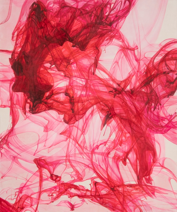 水中に落ちた墨が偶然、人形の模様を取った瞬間の写真をモチーフに日本画の技法を用いた絵画を制作している。