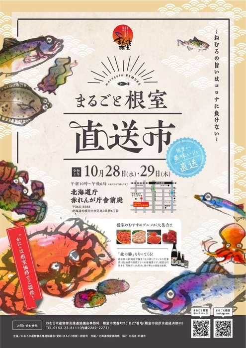 ねむろ水産物普及推進協議会(愛称:まるごと根室、会長:根室市長 石垣 雅敏)では、令和2年10月28日(水)~29日(木)の2日間、北海道庁赤れんが庁舎前庭において、「まるごと根室直送市」を開催します。
