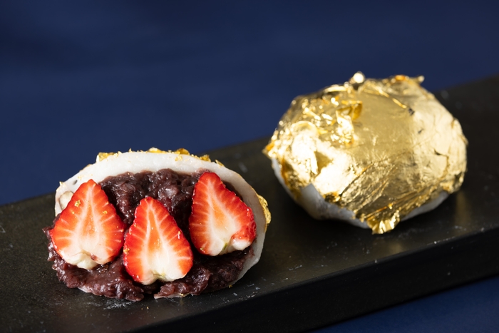 ジャンボサイズのいちご豆大福を丸ごと金箔で包みあげてご提供!