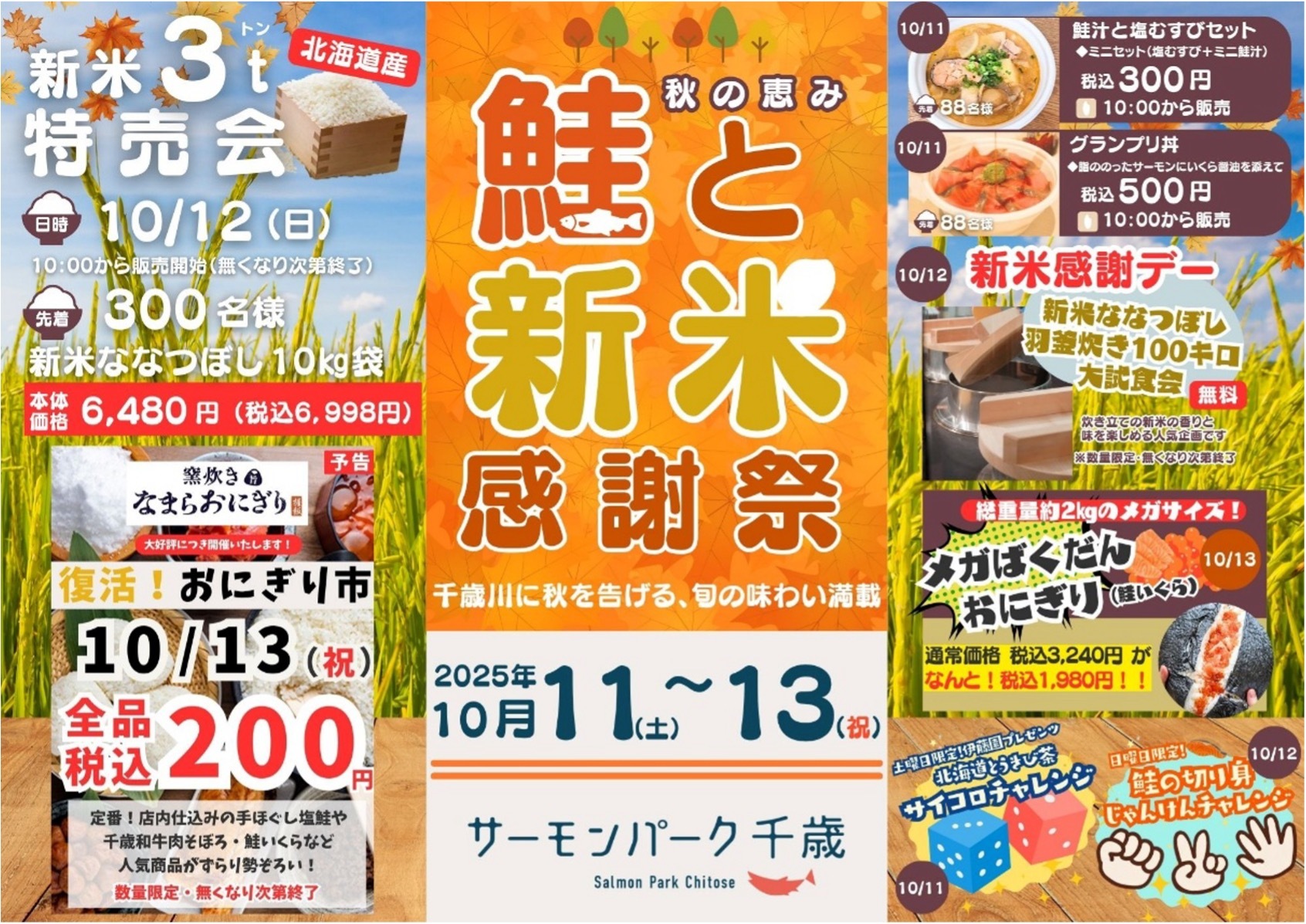 「道の駅サーモンパーク千歳」(所在地:北海道千歳市)は、実りの秋にぴったりのイベント「秋の恵み 鮭と新米感謝祭」を、10月11日(土)~13日(月・祝)の3日間、道の駅サーモンパーク千歳で開催いたします。