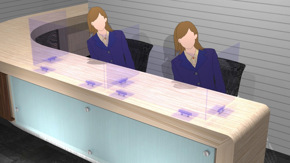 新製品の対面型卓上パーテーションの両サイドに【P_1800016】(写真中)の卓上パーテーションを組み合わせれば、お客様と従業員により安心なイメージを与えられます。