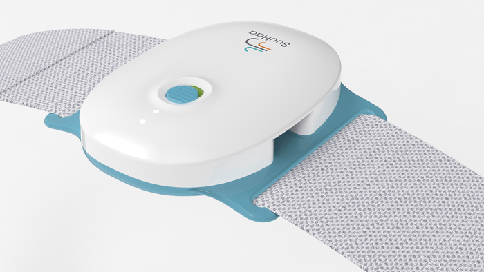 特徴は呼吸測定時に異常がある時、スマホに通知をする機能です。加えて、従来の全身にまきつけるタイプに比べて小型で軽量化されました。