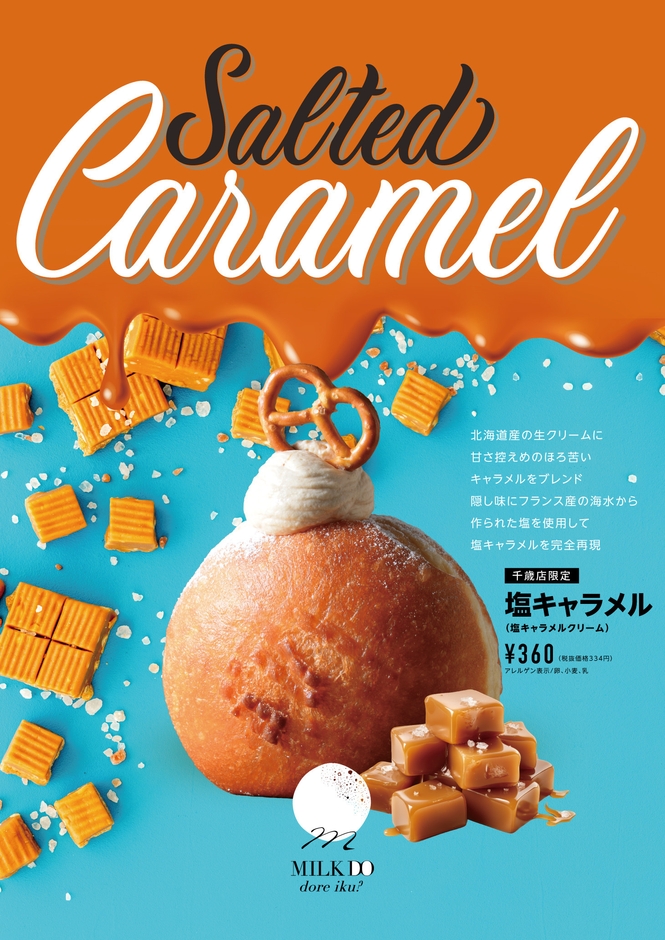通常メニューでは千歳店だけしか買えない、「塩キャラメル」360円も販売。北海道産の生クリームに甘さ控えめのほろ苦いキャラメルパウダーをブレンド。隠し味にフランス産の海水から作られた塩を使用して塩キャラメルを完全再現したドーナッツです。