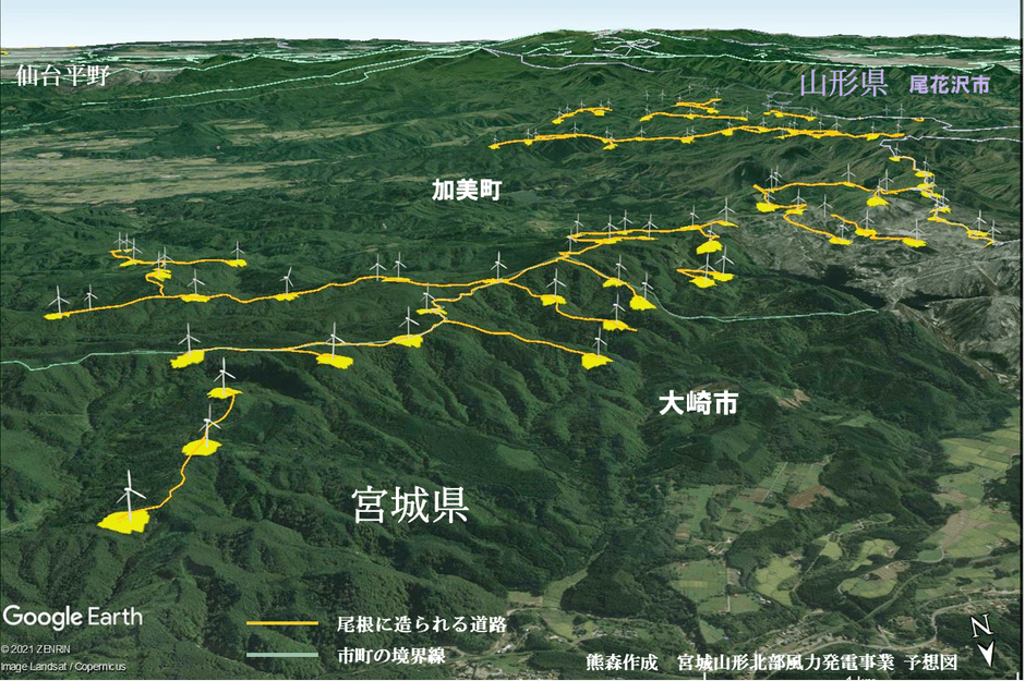 加美町は、宮城県北部に位置し、2017年に「世界農業遺産」として認定された大崎耕土の水源地としても知られています。大崎耕土は、奥羽山脈からもたらされる清らかな水と、約400年前からの先人たちの知恵によって築かれた財産であると同時に、戦後の開発によって居場所を失った雁など渡り鳥たちの最後の楽園でもあります。加美郡の水田地帯を取り囲む奥羽山脈の尾根筋に、高さ200m級の風車が最大約170基立ち並ぶ計画です。日本で、1つの町の山間部にこれだけ大規模な風車群が建設された例は他にありません。建設予定地は、林野庁の管理する国有林の緑の回廊を含み、水源かん養保安林、土砂流出防備保安林、土砂崩壊防備保安林、宮城県水道水源特定保安地域、加美町水資源保全地域などに、計画されています。加美町の未来を守る会と風力発電を考える色麻の会は、子どもたちに自然のままの加美の山を残すため活動しています。