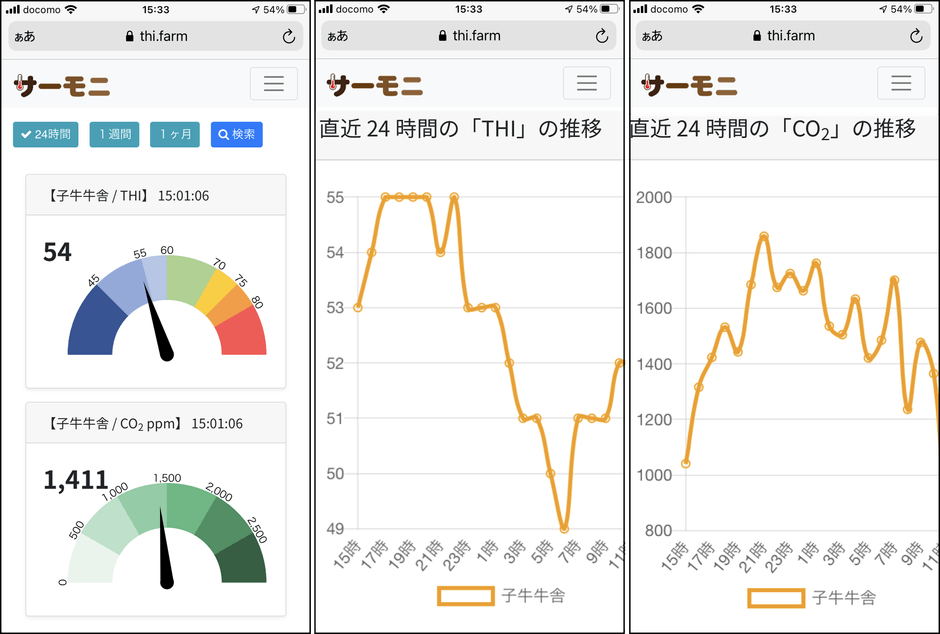 環境センサーで得られたCO2濃度のグラフ表示、温度と湿度から温湿度指数(THI)を算出し各畜種に応じた独自の熱環境指標(ストレス度合い)を可視化して農家に提供(専用ウェブサイト)