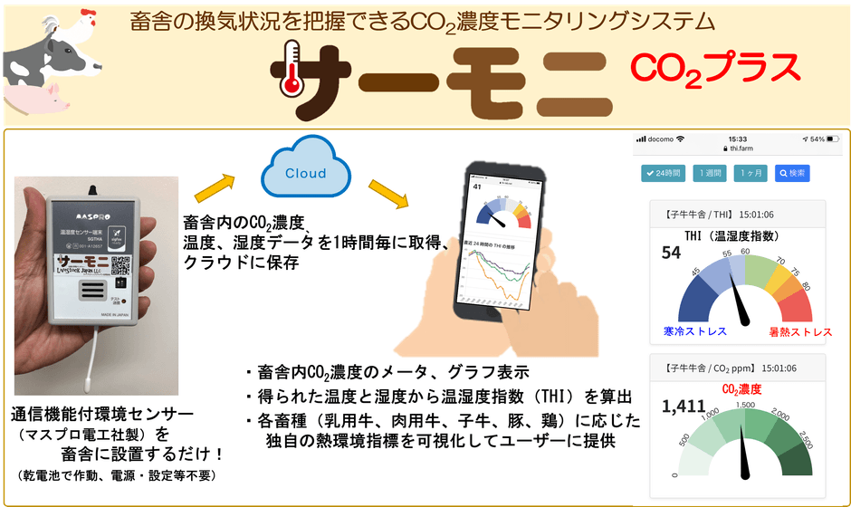 「サーモニ CO2プラス」は、環境センサー端末のみで家畜に対する独自の熱環境指標(ストレス度合い)として畜産農家に提供しているサービス「サーモニ」に、CO2濃度をモニタリングできる機能を新たに付加したものです。