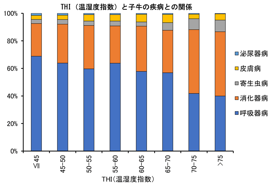 畜舎においては、家畜の呼気による二酸化炭素やメタン、排泄物から発生するアンモニアなどの有害ガスが蓄積します。アンモニア濃度が高い畜舎では、特に幼畜において鼻・気管の粘膜が炎症を起こし易いことが知られており、子牛では換気不足になりがちな冬期に呼吸器疾患が増加することが報告されています。