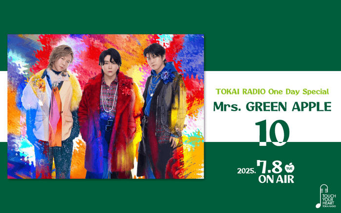 TOKAI RADIOは7月8日(火)に「TOKAI RADIO One Day Special "Mrs. GREEN APPLE 10"」と題し、同日発売のアニバーサリーベストアルバム「10」を特集する。アルバム収録曲を中心に、4時45分から17時00分までのワイド番組で、Mrs. GREEN APPLEの楽曲をたっぷりとお届けする。