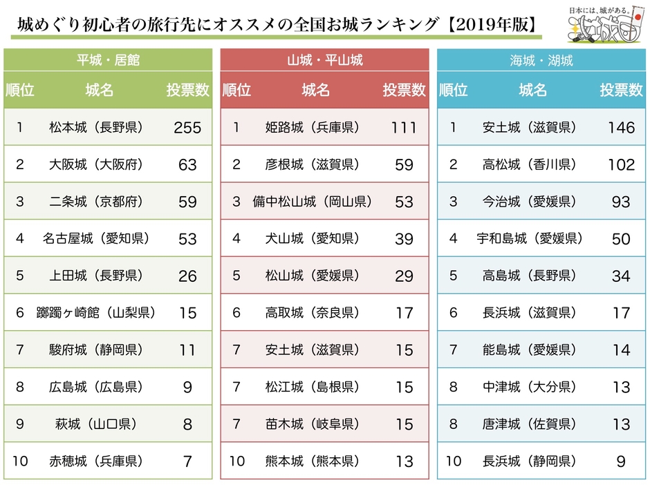 攻城団が「城めぐり初心者の旅行先にオススメの全国お城ランキング 2019」を発表