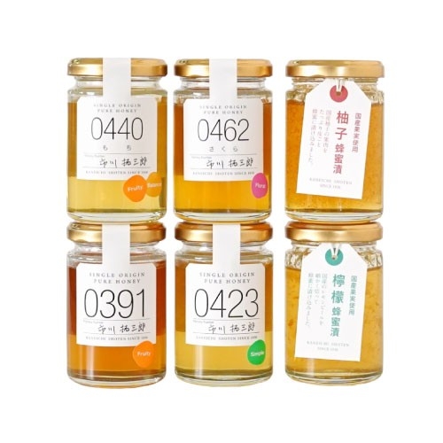 内容:国産シングルオリジンハニー4本と、人気の蜂蜜漬け2本が入って大変お得な初めての方にもおすすめのセットです。
