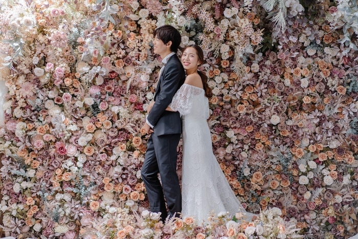 たくさんのお花が壁一面に花開く、フラワーウォールスタジオ。スタジオの中でお花畑のような撮影を楽しめます。「ロケ撮影だと日程の都合がつけにくい」「暑い時期は体調が心配」といったおふたりにもおすすめです。