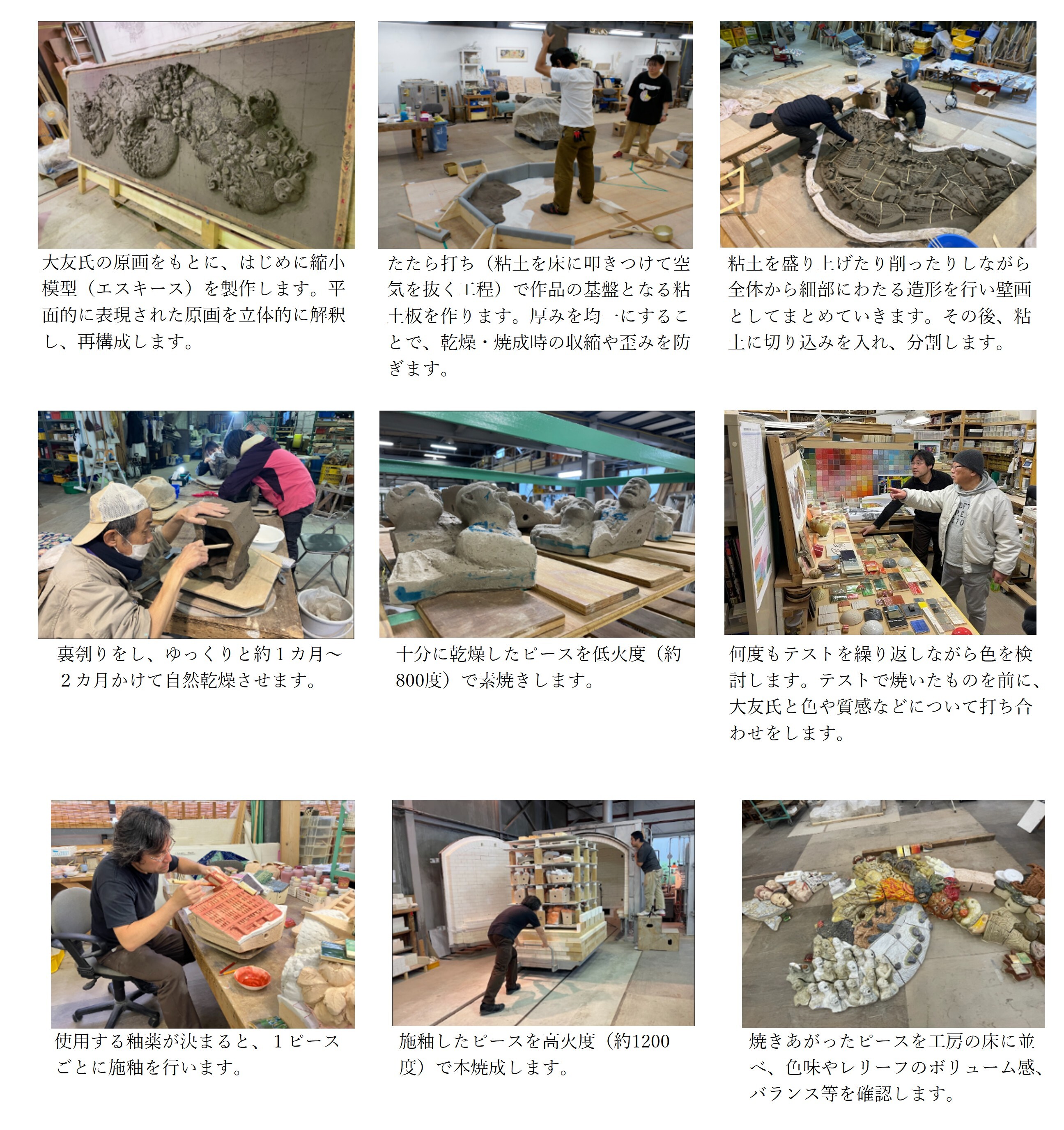 なお本作品は、日本交通文化協会の563作品目のパブリックアートとして企画しました。大友氏が約3年かけて描いた原画をもとに、クレアーレ熱海ゆがわら工房(静岡県熱海市)の職人7人が約2年かけて製作しました。