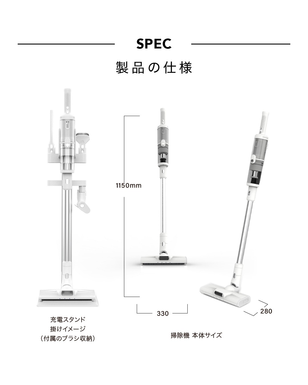【製品仕様】・製品名:V-SCAN100・サイズ:[詳細サイズがあれば記載、なければ省略可]・本体重量:約0.9kg・吸引力:最大20,000Pa・バッテリー:着脱式リチウムイオンバッテリー・付属品:充電スタンド、すき間ブラシー、ダストブラシー