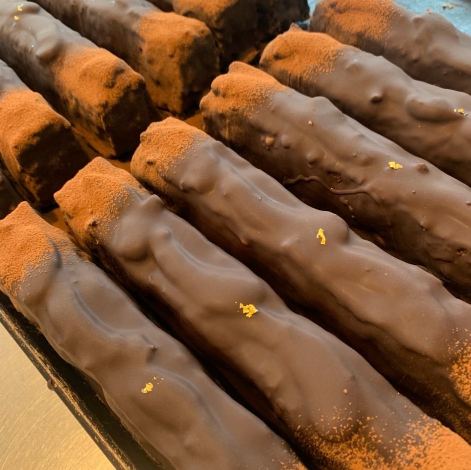 生地は必須アミノ酸が多く含まれる和歌山県産平飼い有精卵で旨味を引出し、66%のクーベルチュールチョコレートを使用することで滑らかな舌触りにしております。仕上げにチョコレートでコーティングすることで、外はパリッとなかはジューシーになっております。