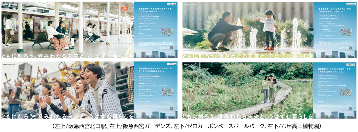 阪急西宮北口駅、阪急西宮ガーデンズ、ゼロカーボンベースボールパーク、六甲高山植物園の風景と、「長期経営構想における環境分野の取組方針」に基づく各施設の取組をキャッチコピーとともに表現したポスターを順次掲出します。日常の風景の中で、当社グループが描くサステナブルな未来への想いを感じていただけるデザインとなっています。