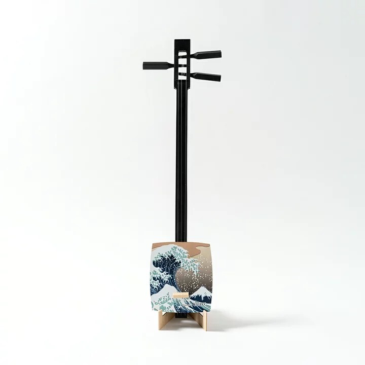三味線をもっと身近に楽しめるよう開発された、持ち運びしやすい簡易版三味線。通常の約3分の2サイズで軽量ながら、職人が音色にこだわり、小型でも本格的な三味線の響きを楽しめる一品です。