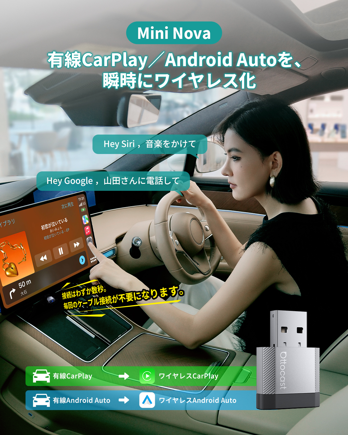 純正USBポートに挿すだけで、CarPlay/Android Autoをワイヤレス化。より快適なドライブ体験を実現します。