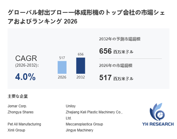 YHResearch調査チームの最新レポート「グローバル射出ブロー一体成形機のトップ会社の市場シェアおよびランキング 2026」によると、2026年の517百万米ドルから2032年には656百万米ドルに成長し、2026年から2032年の間にCAGRは4.0%になると予測されています。
