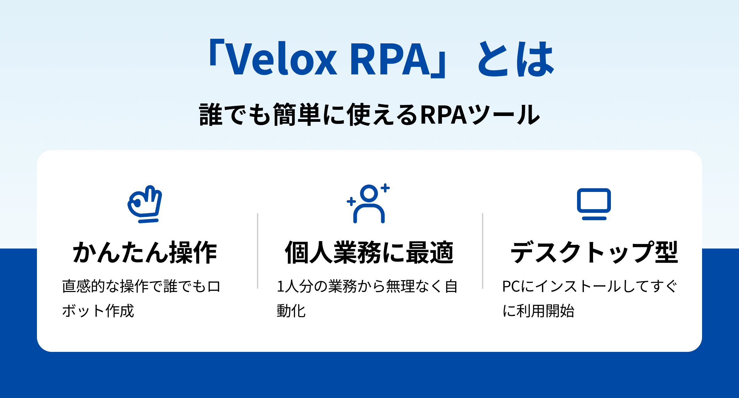 「Velox RPA」は、プログラミングが不要で、Microsoft(R) Excel(R)を活用してロボットを作成することができる、業務自動化ツール(RPA)です。専門知識がなくても現場主導で業務自動化を進められる点が特長で、定型業務の自動化を通じて、生産性向上や業務負荷の軽減を支援します。