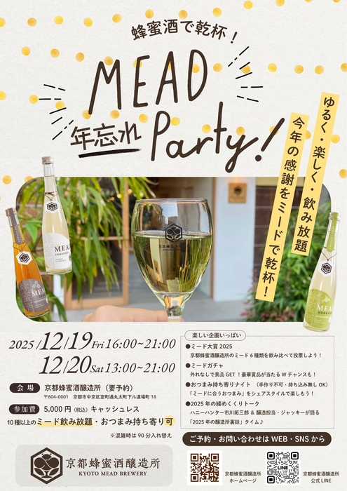 蜂蜜酒(ミード)専門のミーダリー・京都蜂蜜酒醸造所(運営:株式会社金市商店/本社:京都市中京区)は、2025年12月19日(金)・20日(土)の2日間、1年間の感謝を込めたファン交流イベント「年忘れミードパーティ」を開催いたします。