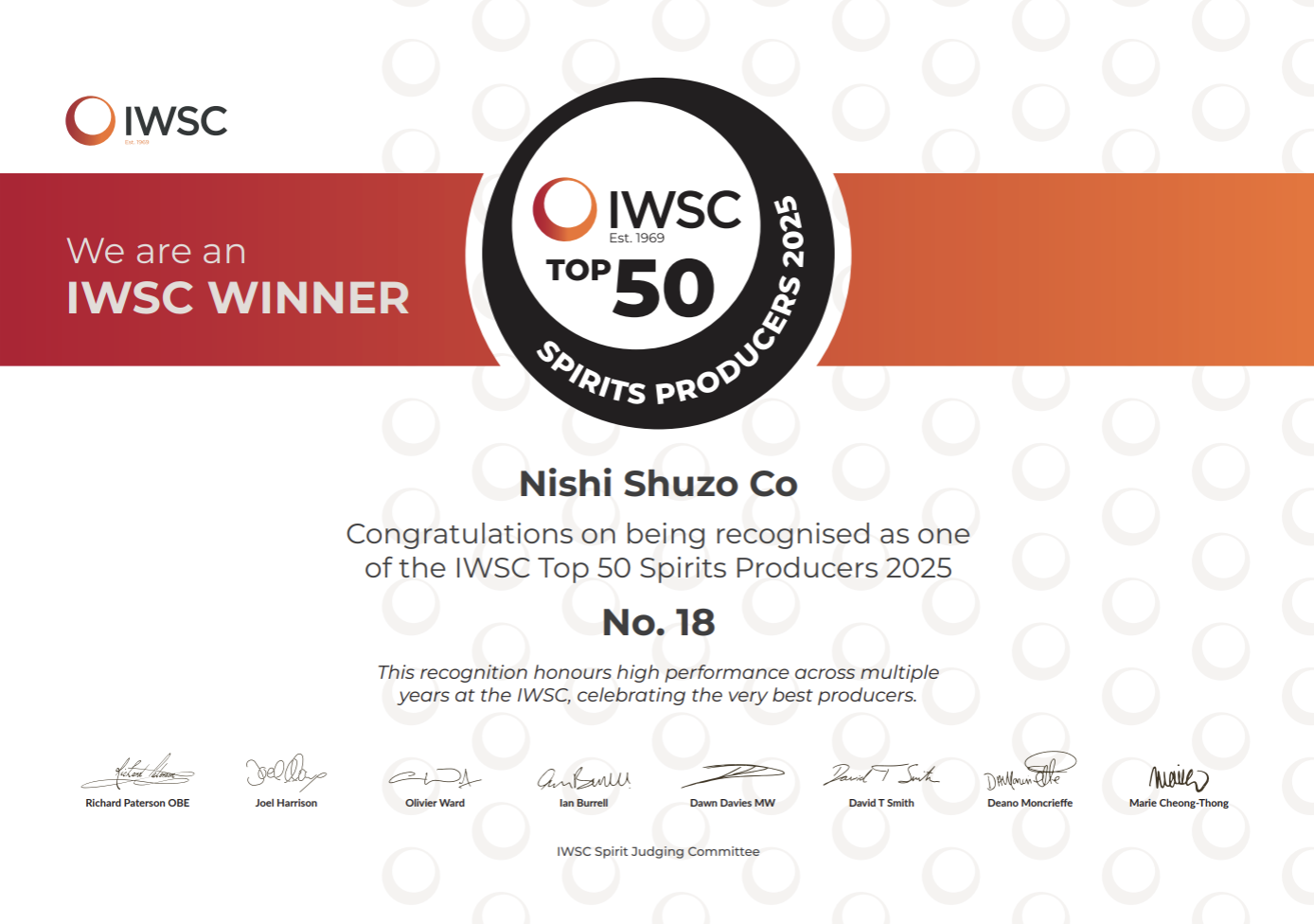 世界中から寄せられる多数のスピリッツの出品の中から、過去の受賞実績をもとに“継続して高品質な酒を造る生産者”を選び抜く公式リストで、“世界で優れた造り手”を示す、信頼性の高い指標としてIWSCが発表しています。