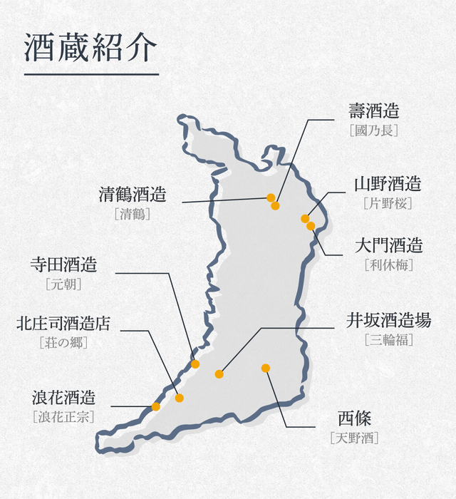 参加酒造 : 9社 寺田酒造(岸和田市)、壽酒造(高槻市)、浪花酒造(阪南市)、清鶴酒造(高槻市)、 北庄司酒造店(泉佐野市)井坂酒造(岸和田市)、大門酒造(交野市)、 山野酒造(交野市)、西條(河内長野市)